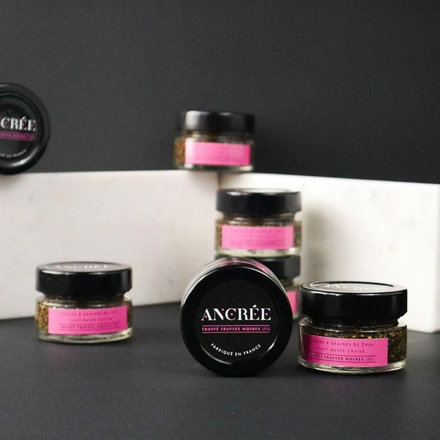 Unique en France. Algues bretonnes, graines de chia d'Ile-de-France, sauce soja, vinaigre de riz, truffe noire (3%), sel et poivre. Ce luxueux mariage terre / mer, inédit et raffiné, propose un juste équilibre des saveurs, avec une texture très similaire au caviar traditionnel. Nous l'apprécions sur un blinis de fromage frais ou sur un œuf parfait. En vous souhaitant une très belle dégustation !